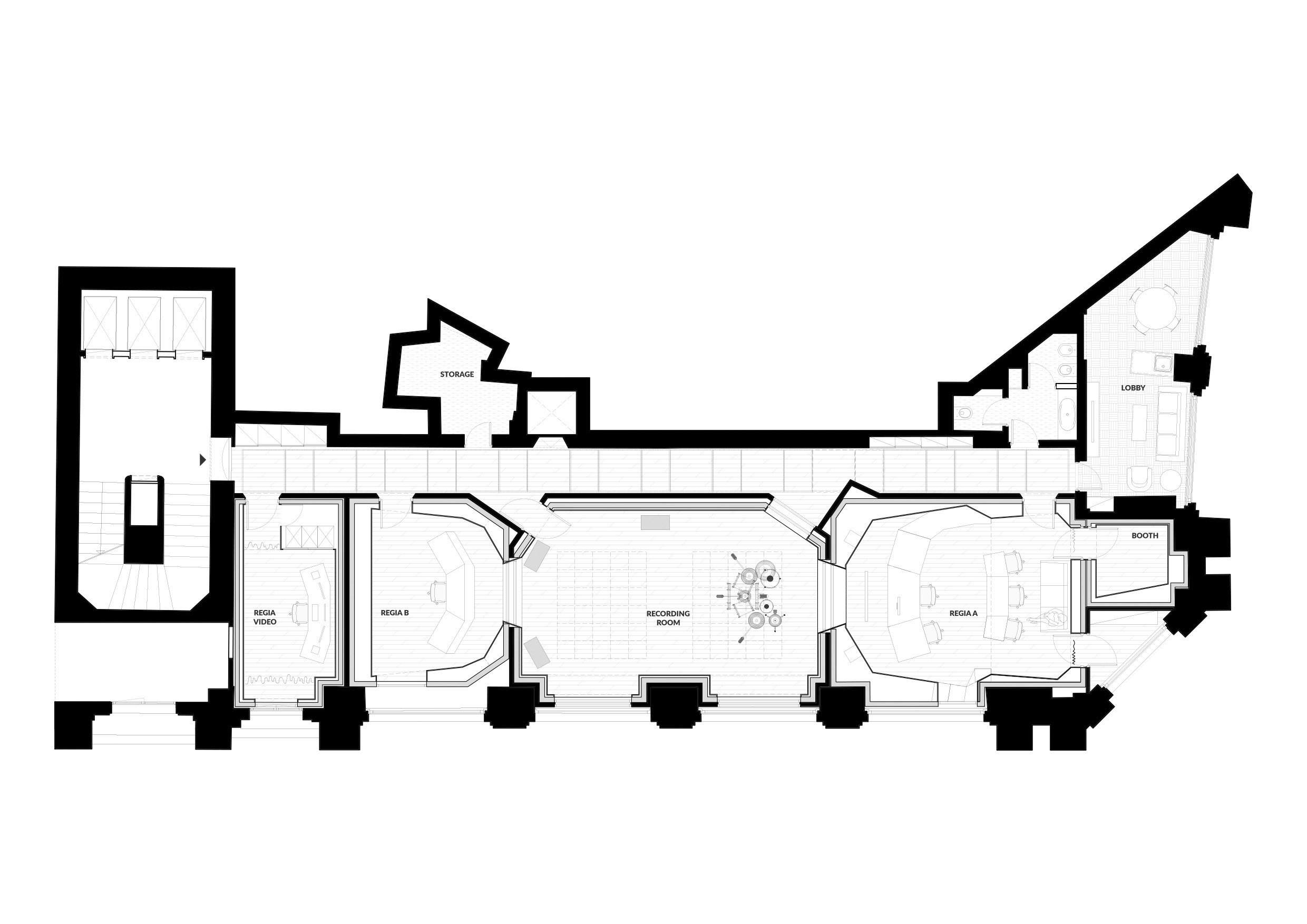 La pianta mostral’organizzazione spaziale dello studio e il sistema costruttivo che ne definisce le prestazioni acustiche: una sequenza di ambienti indipendenti progettati per garantire isolamento, controllo del suono e qualità dell’ascolto