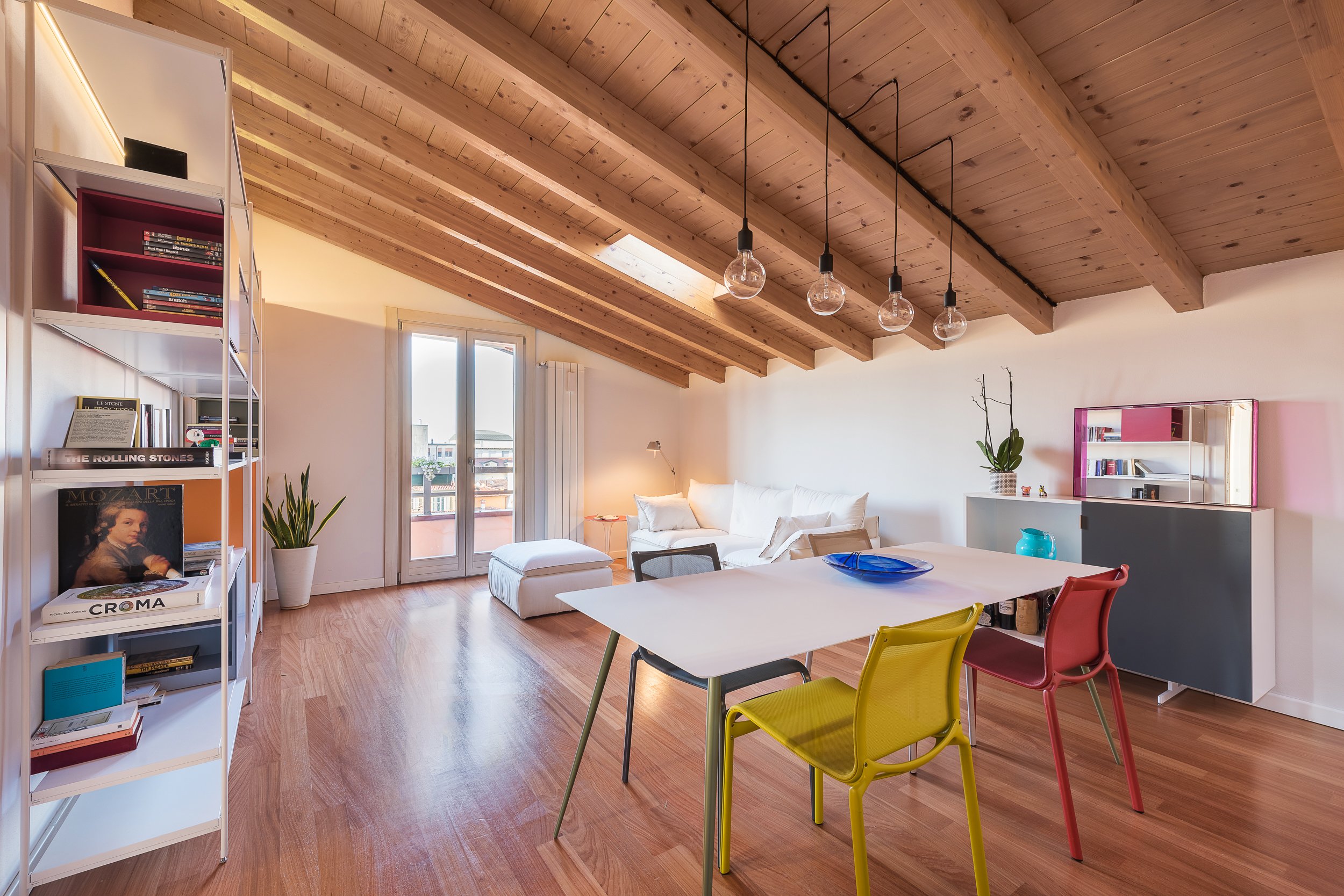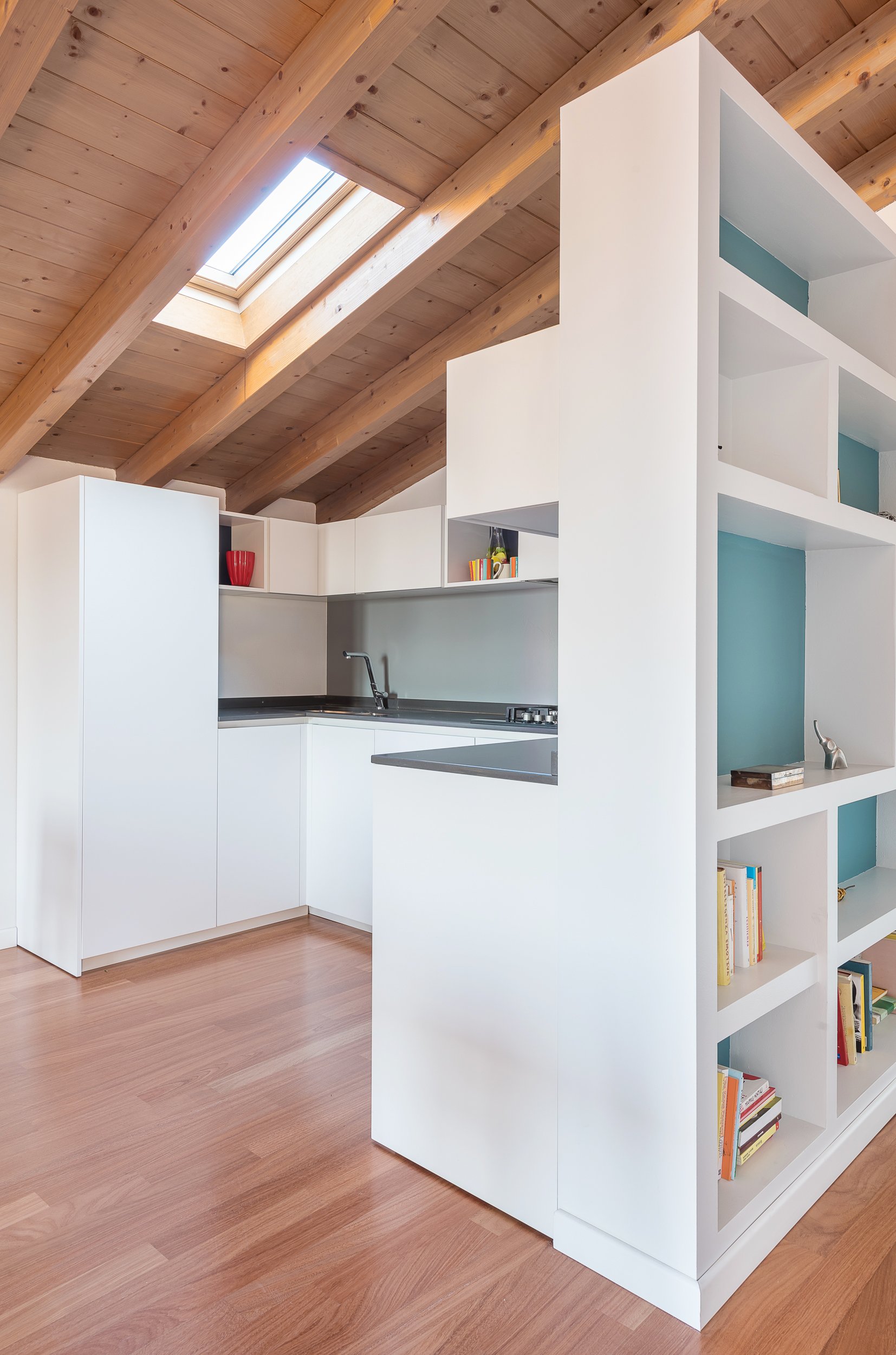 Con questo progetto abbiamo trasformato il sottotetto di un edificio degli anni Settanta, originariamente utilizzato come studio professionale, in un appartamento pensato per una giovane coppia.