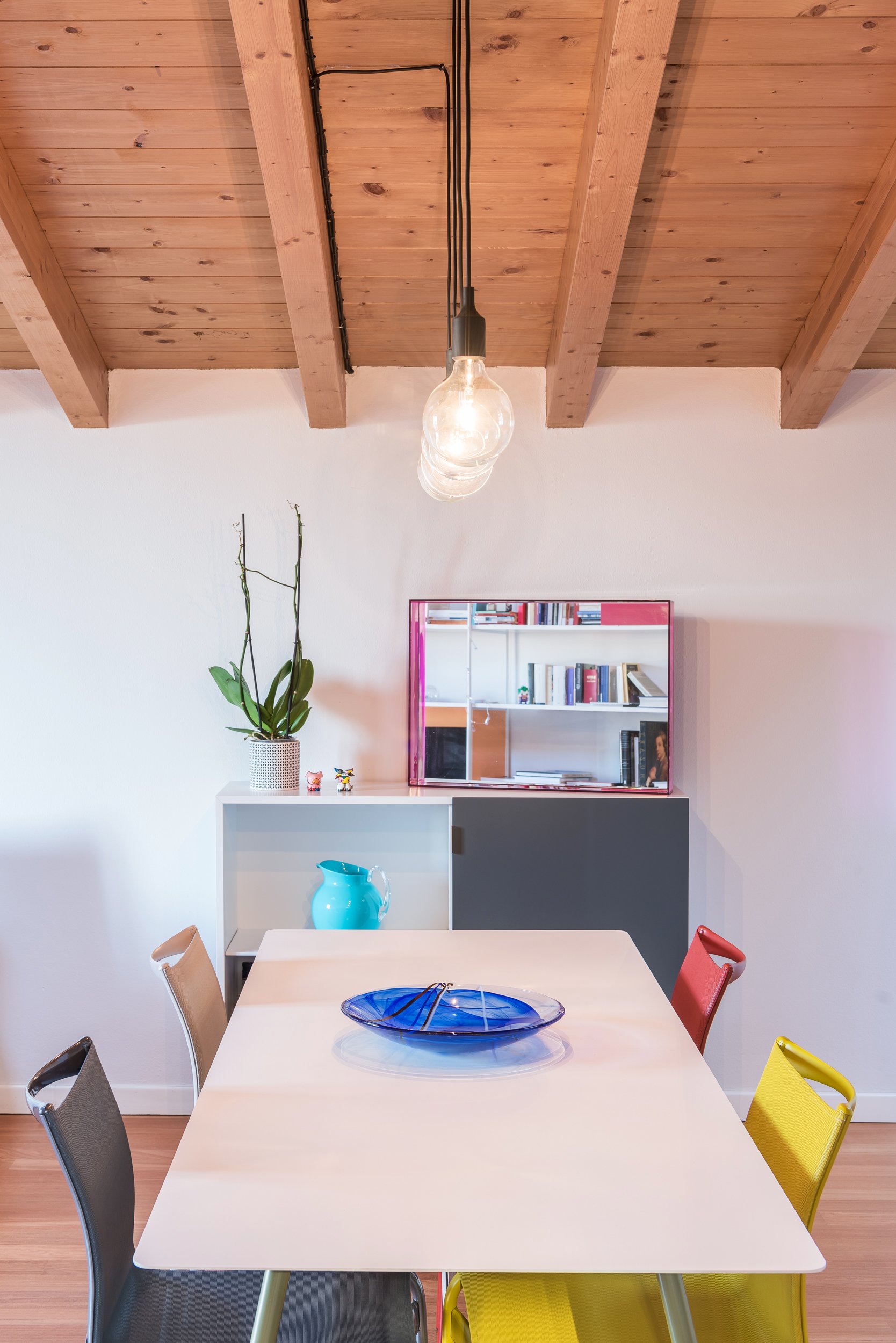 La zona pranzo si organizza attorno a un tavolo lineare e molto essenziale, con top in HPL di soli 3 mm di spessore, che accompagna il passaggio tra cucina e soggiorno. Sopra di lui, quattro lampade a bulbo grande di ispirazione scandinava costruiscono una sorta di quinta luminosa, capace di segnare con delicatezza l’area del pranzo.