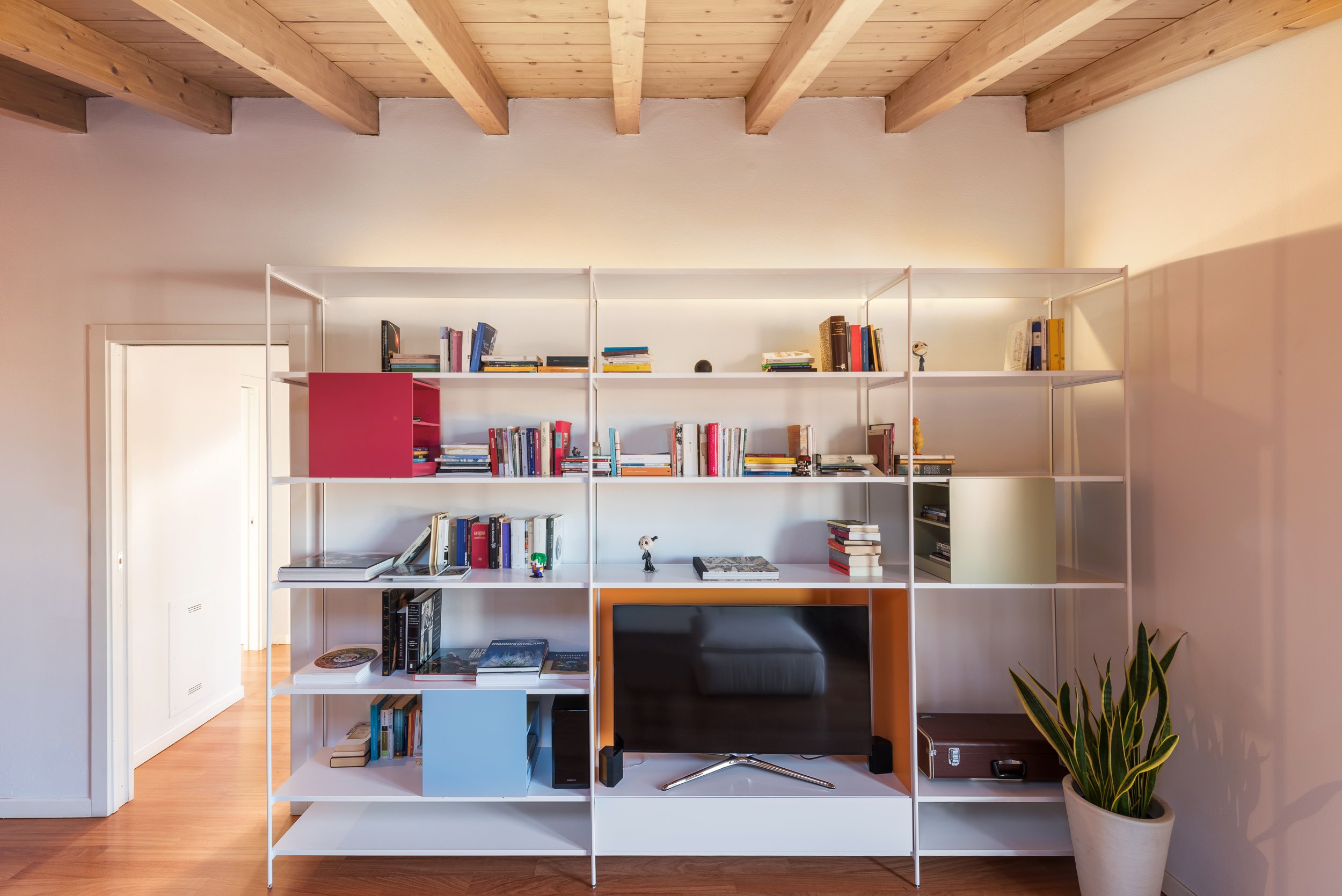 L’area living si sviluppa invece attorno a un sistema giorno con libreria lineare in alluminio. Nella parte centrale abbiamo integrato gli apparati di entertainment all’interno di cassetti dedicati, mentre alcuni cubi laccati nei toni pastello funzionano come contenitori per CD e DVD, lasciando spazio a libri e oggetti. Di fronte, un divano con pouf completa un ambiente raccolto, flessibile e domestico.