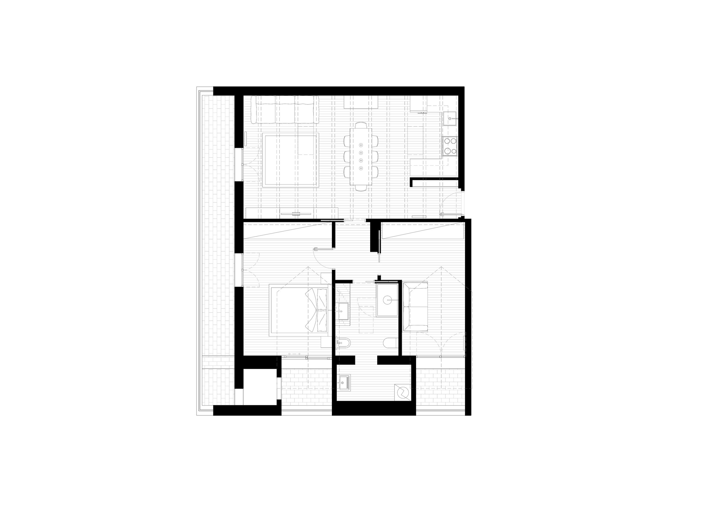 La pianta restituisce l’organizzazione dello spazio; da essa si può leggere il ruolo dell’arredo su misura nella definizione funzionale del layout.