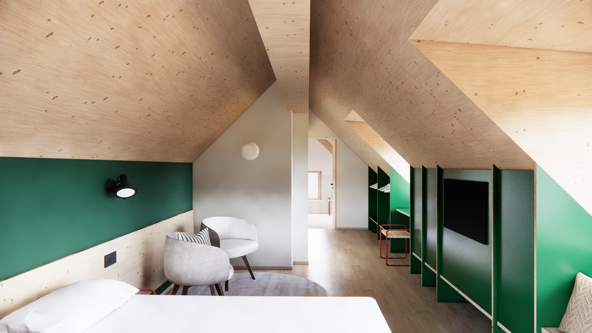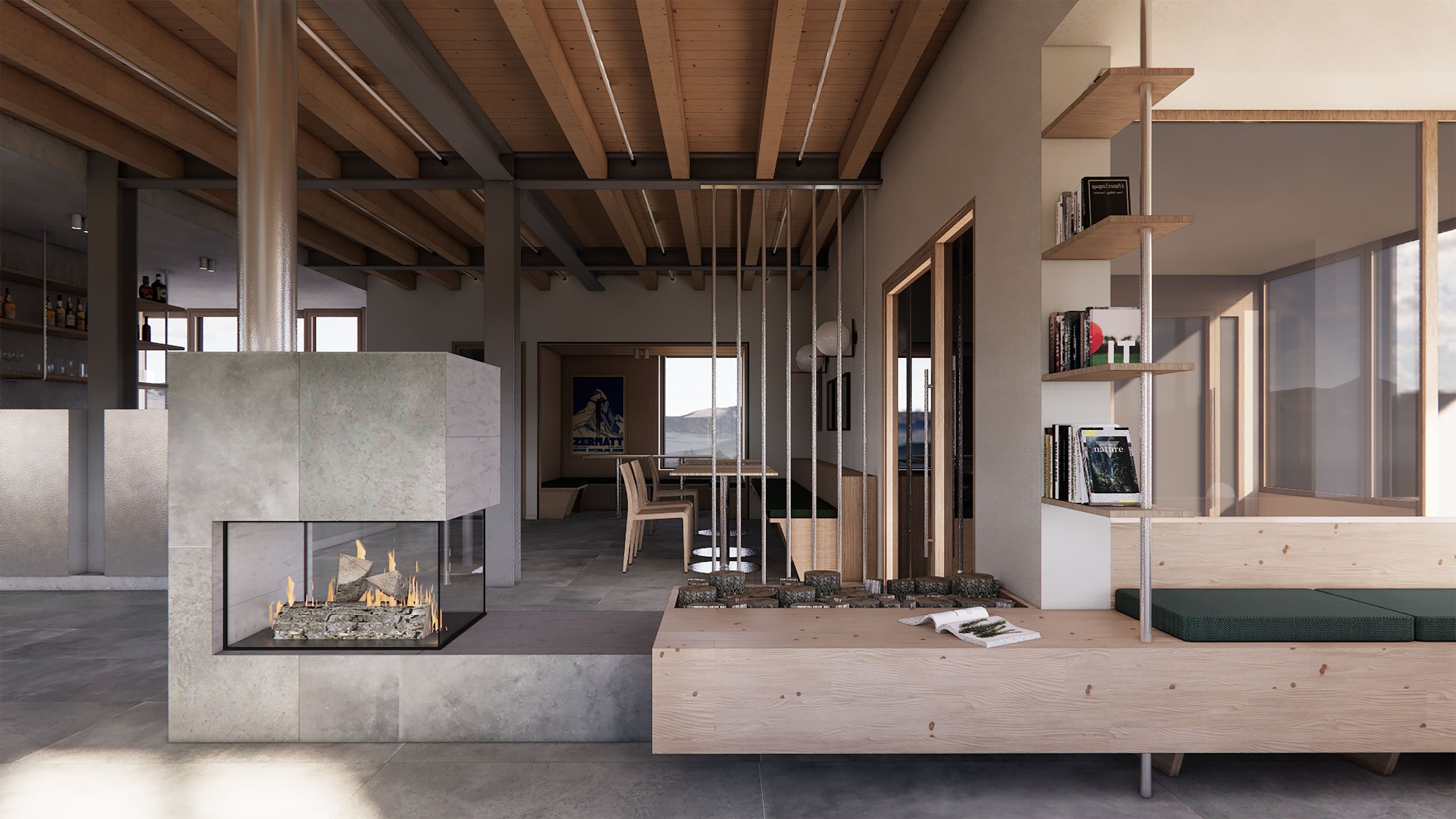 La struttura si compone di 9 camere, otto al primo piano e una suite nel livello mansardato, mentre il piano terra ospita bar e area lounge. Rispetto allo chalet a quota inferiore, qui l’impostazione è più compatta e concentrata: un rifugio che risponde in modo diretto alle condizioni climatiche e alla dimensione più aspra del contesto.