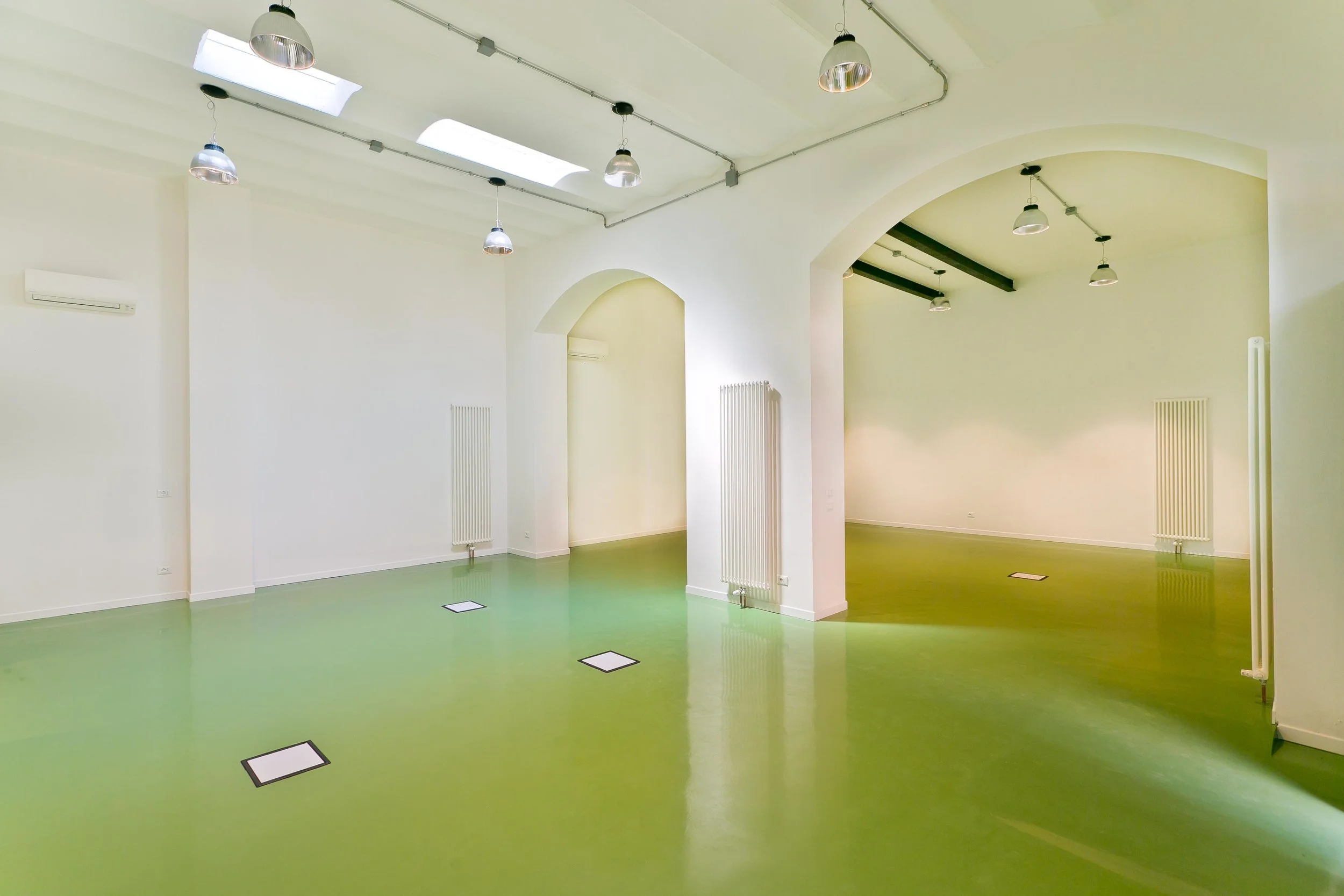 The 4.3 meters high white ceilings and walls are counterbalanced by a lush green epoxy floor, which serves as a common ground for the open plan layout.